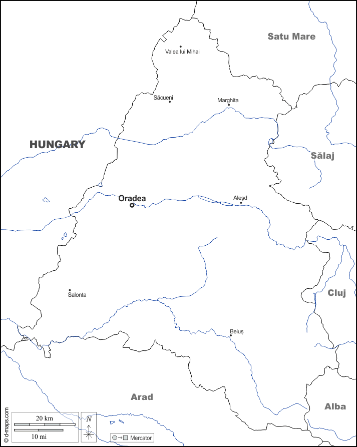 d-maps > यूरोप > रोमानिया > बिहोर काउंटी > सीमाओं, जल-सर्वेक्षण, मुख्य शहरों, नाम, सफेद