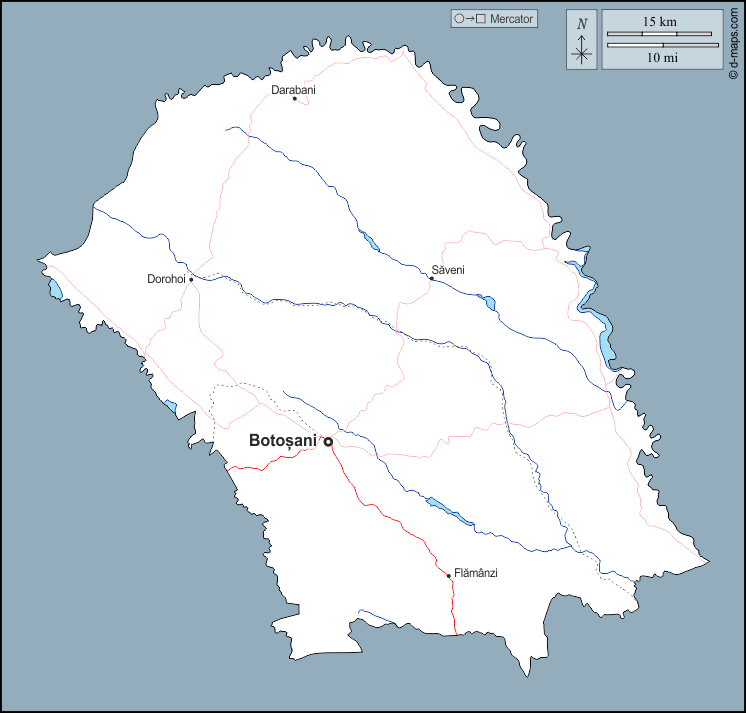 d-maps > यूरोप > रोमानिया > बोटोसानी > बाह्यरेखा, जल-सर्वेक्षण, मुख्य शहरों, सड़कों, नाम