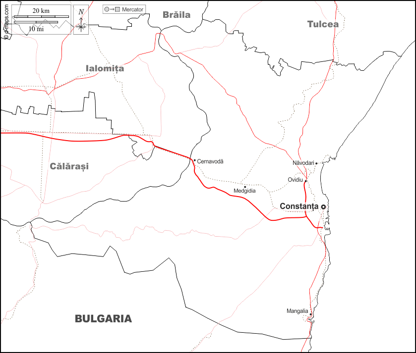 d-maps > यूरोप > रोमानिया > कॉस्टैंटा > सीमाओं, मुख्य शहरों, सड़कों, नाम, सफेद