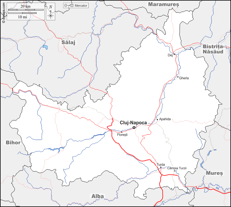 d-maps > यूरोप > रोमानिया > क्लुज > सीमाओं, जल-सर्वेक्षण, मुख्य शहरों, सड़कों, नाम