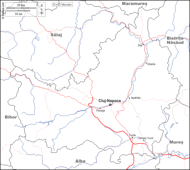 d-maps > यूरोप > रोमानिया > क्लुज > सीमाओं, जल-सर्वेक्षण, मुख्य शहरों, सड़कों, नाम, सफेद