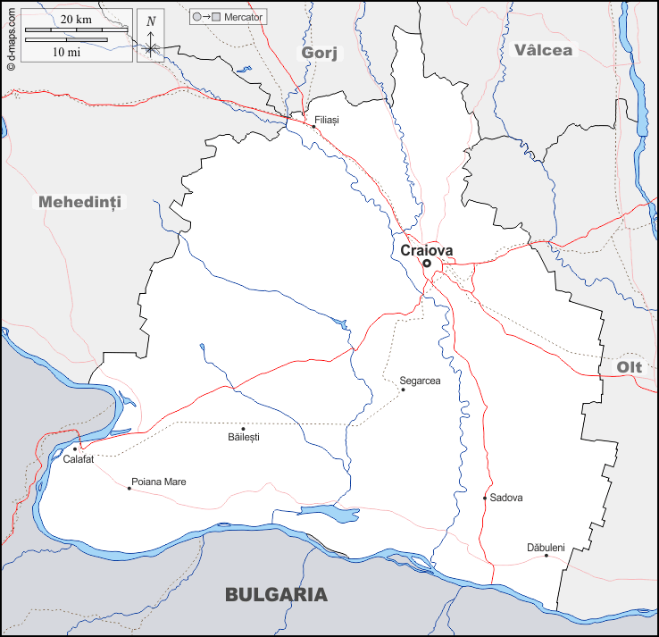 d-maps > यूरोप > रोमानिया > डोल्ज > सीमाओं, जल-सर्वेक्षण, मुख्य शहरों, सड़कों, नाम