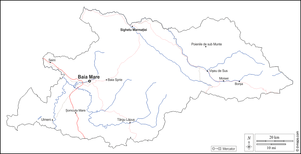 d-maps > यूरोप > रोमानिया > मारामुरेस > बाह्यरेखा, जल-सर्वेक्षण, मुख्य शहरों, सड़कों, नाम, सफेद