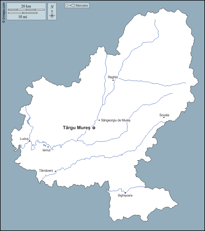 d-maps > यूरोप > रोमानिया > मुरेस > बाह्यरेखा, जल-सर्वेक्षण, मुख्य शहरों, नाम