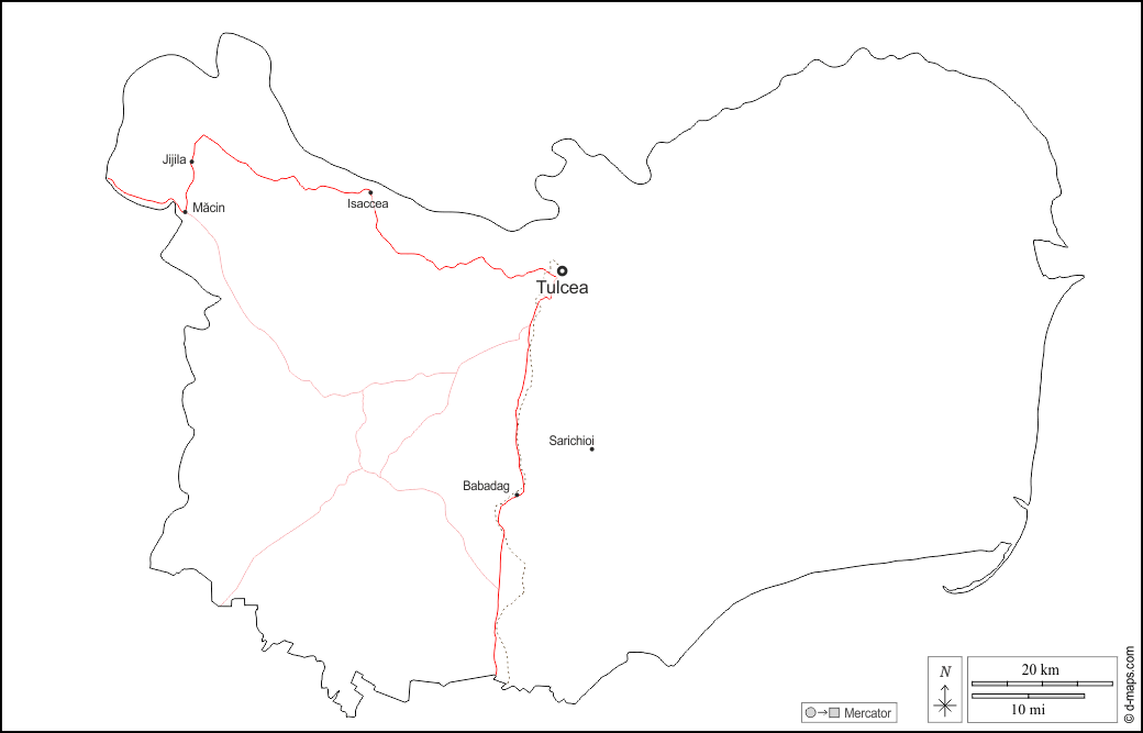 d-maps > यूरोप > रोमानिया > तुलसिया काउंटी > बाह्यरेखा, मुख्य शहरों, सड़कों, नाम, सफेद