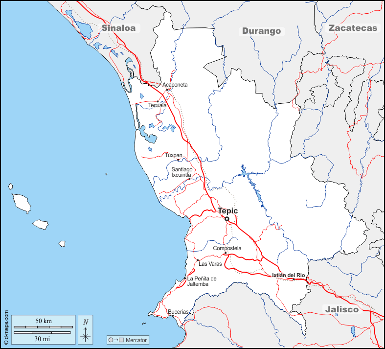 d-maps > महाअमेरिका > मेक्सिको > नायरिट > सीमाओं, जल-सर्वेक्षण, मुख्य शहरों, सड़कों, नाम