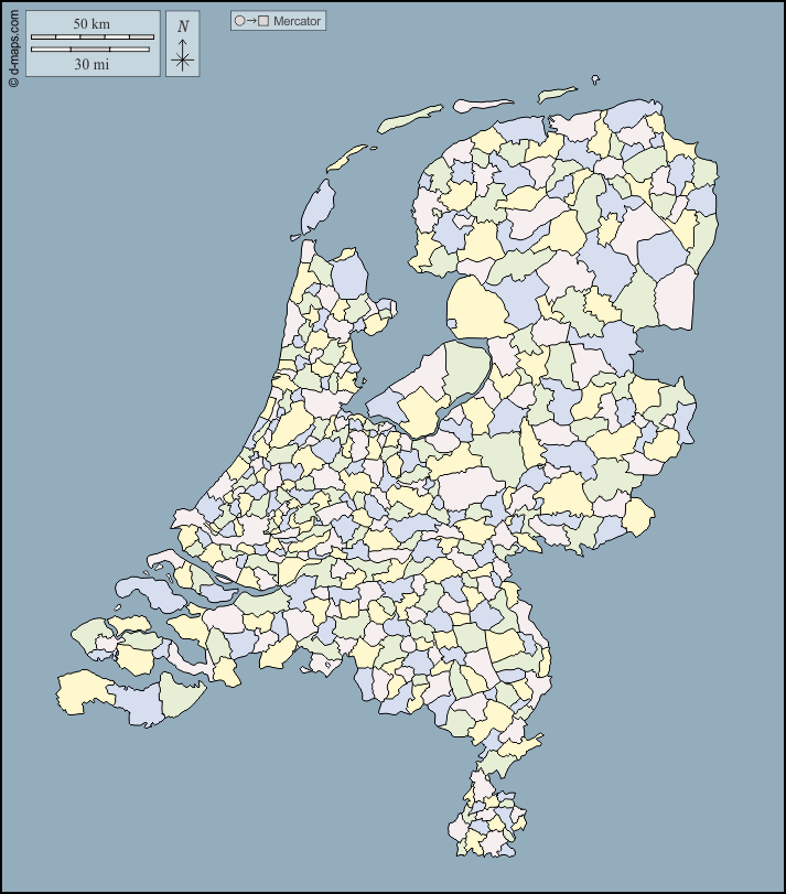 d-maps > यूरोप > नीदरलैंड > नीदरलैंड > बाह्यरेखा, नगर पालिकाओं, रंग