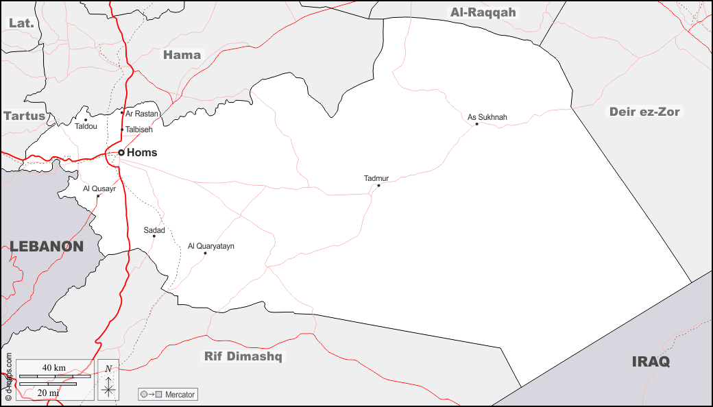 d-maps > एशिया > सीरिया > होम्स > सीमाओं, मुख्य शहरों, सड़कों, नाम