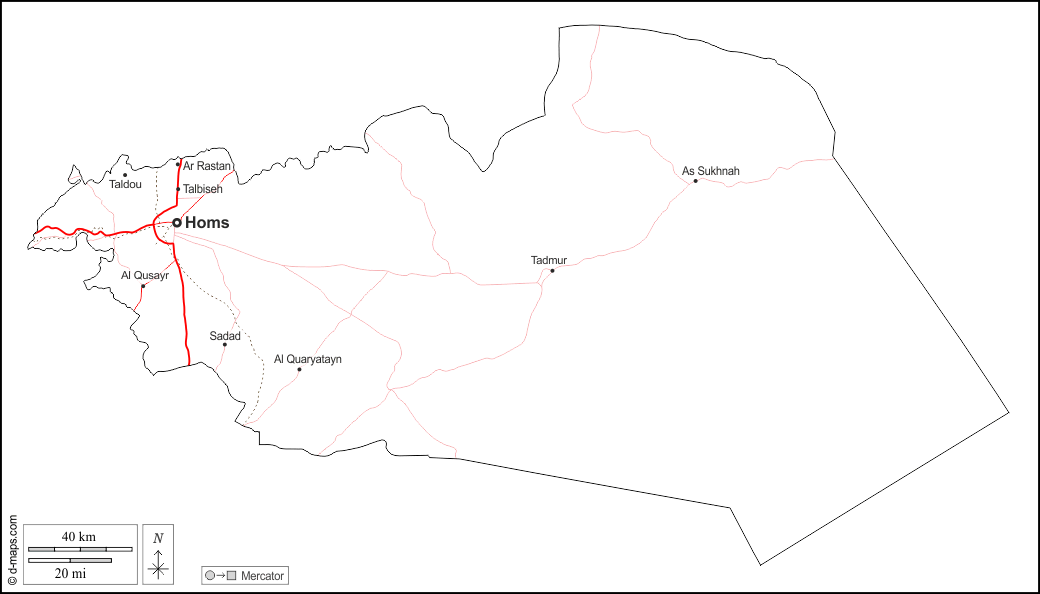 d-maps > एशिया > सीरिया > होम्स > बाह्यरेखा, मुख्य शहरों, सड़कों, नाम, सफेद