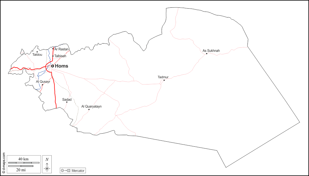 d-maps > एशिया > सीरिया > होम्स > बाह्यरेखा, जल-सर्वेक्षण, मुख्य शहरों, सड़कों, नाम, सफेद