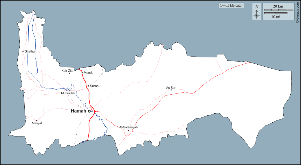 d-maps > एशिया > सीरिया > हामा > बाह्यरेखा, जल-सर्वेक्षण, मुख्य शहरों, सड़कों, नाम