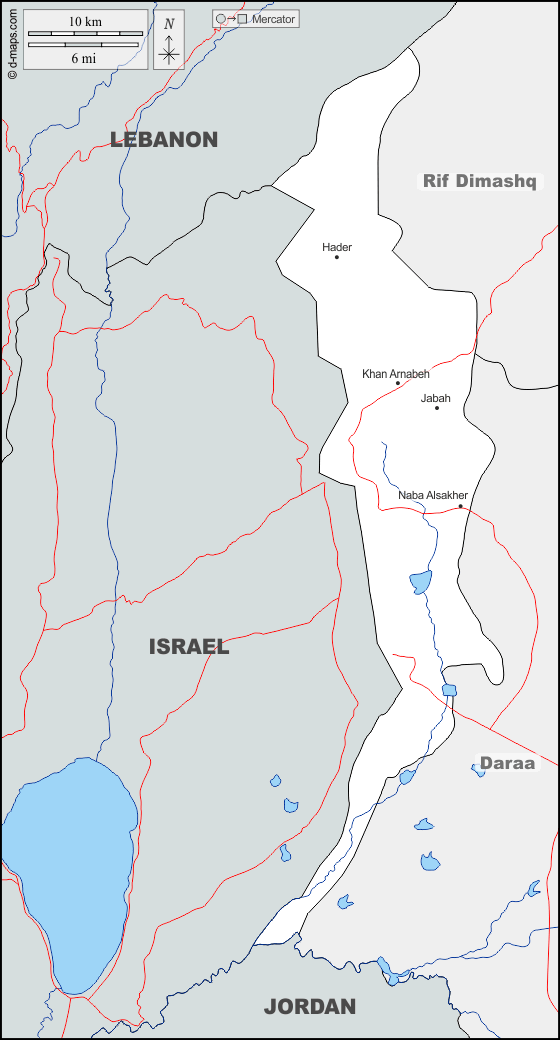 d-maps > एशिया > सीरिया > कुनेत्रा > सीमाओं, जल-सर्वेक्षण, मुख्य शहरों, सड़कों, नाम