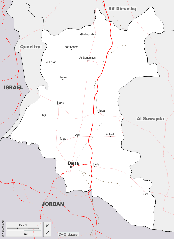 d-maps > एशिया > सीरिया > दारा > सीमाओं, मुख्य शहरों, सड़कों, नाम