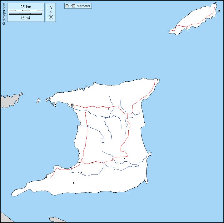 d-maps > महाअमेरिका > त्रिनिदाद और टोबैगो > सीमाओं, जल-सर्वेक्षण, मुख्य शहरों, सड़कों