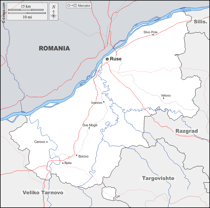d-maps > यूरोप > बल्गारिया > रुसे प्रांत > सीमाओं, जल-सर्वेक्षण, मुख्य शहरों, सड़कों, नाम