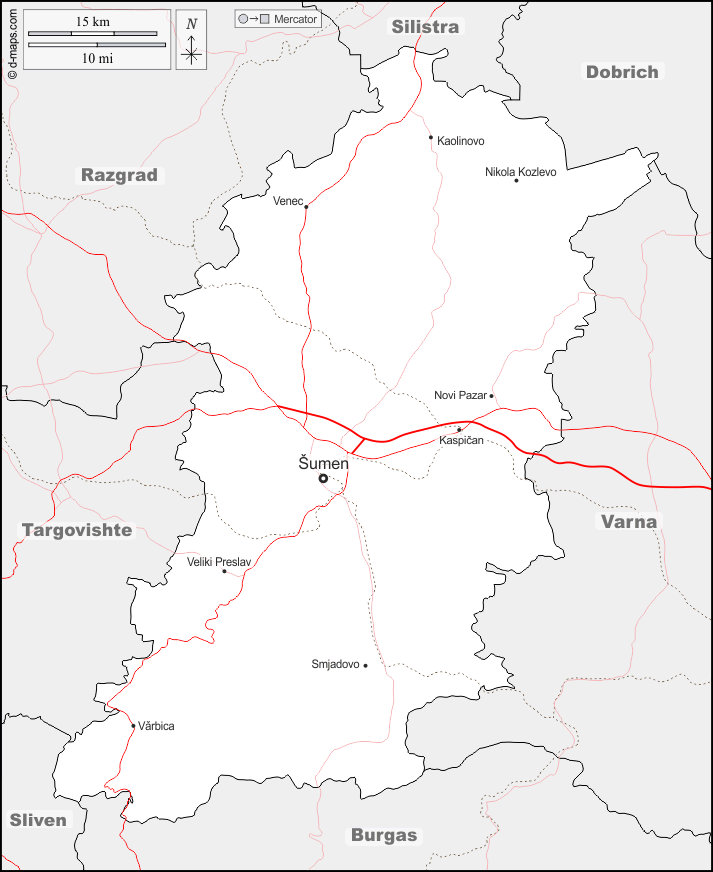 d-maps > यूरोप > बल्गारिया > शुमेन प्रांत > सीमाओं, मुख्य शहरों, सड़कों, नाम