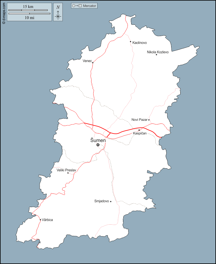 d-maps > यूरोप > बल्गारिया > शुमेन प्रांत > बाह्यरेखा, मुख्य शहरों, सड़कों, नाम