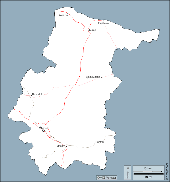 d-maps > यूरोप > बल्गारिया > व्रात्सा प्रांत > बाह्यरेखा, मुख्य शहरों, सड़कों, नाम
