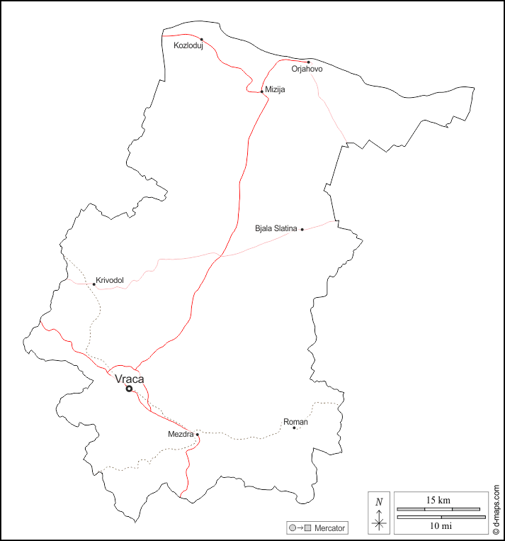 d-maps > यूरोप > बल्गारिया > व्रात्सा प्रांत > बाह्यरेखा, मुख्य शहरों, सड़कों, नाम, सफेद