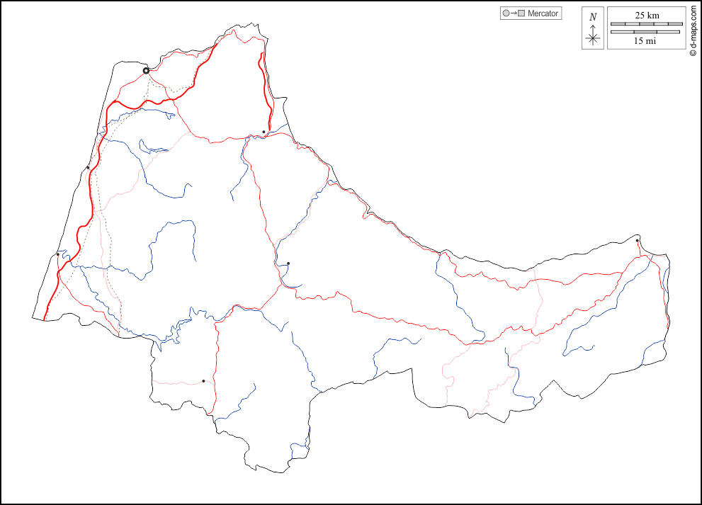 d-maps > अफ्रीका > मोरक्को > टेंगर-टेटुआन-अल होसेइमा > बाह्यरेखा, जल-सर्वेक्षण, मुख्य शहरों, सड़कों, सफेद