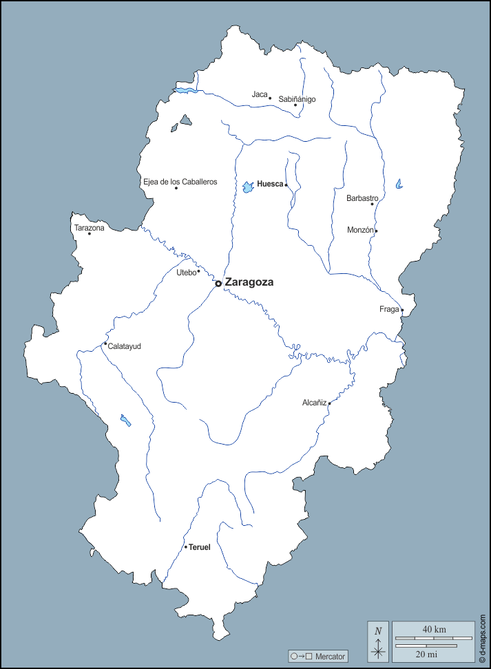 d-maps > यूरोप > स्पेन > आरागोन > बाह्यरेखा, जल-सर्वेक्षण, मुख्य शहरों, नाम