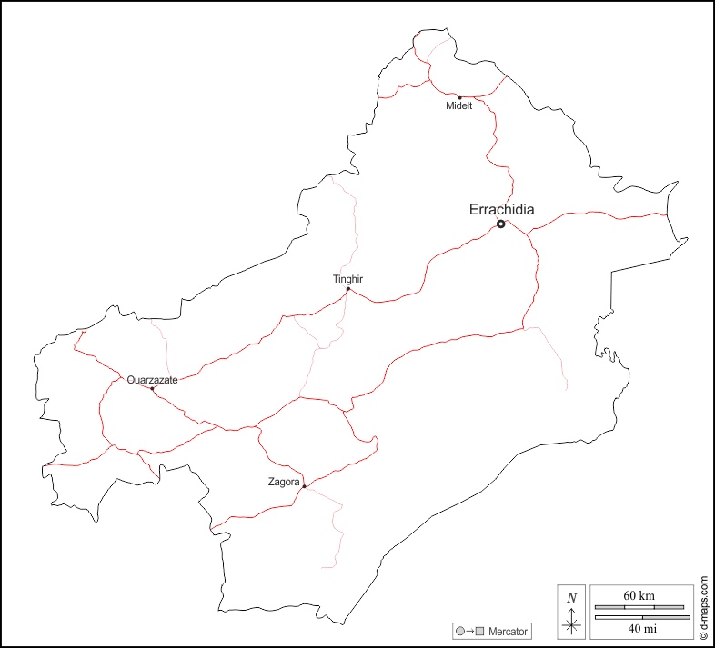 d-maps > अफ्रीका > मोरक्को > ड्रा-तफ़िलालेट > बाह्यरेखा, मुख्य शहरों, सड़कों, नाम, सफेद