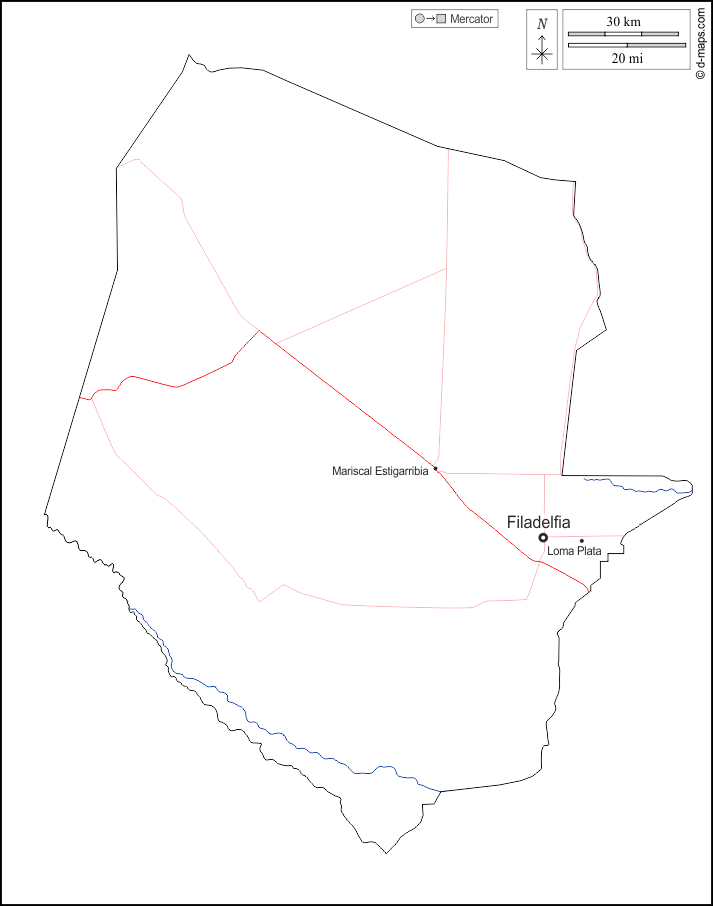 d-maps > महाअमेरिका > पैराग्वे > बोकेरोन > बाह्यरेखा, जल-सर्वेक्षण, मुख्य शहरों, सड़कों, नाम, सफेद