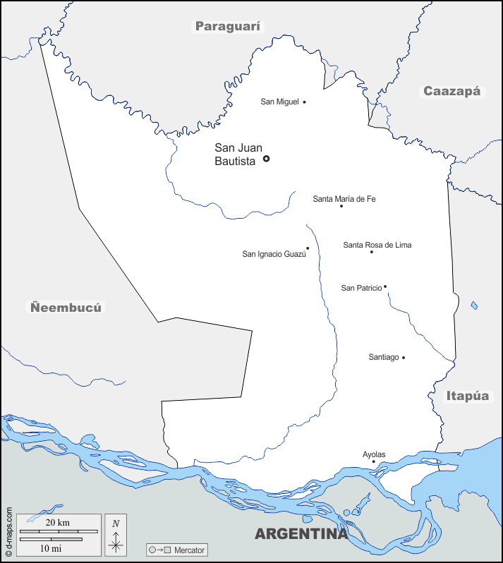 d-maps > महाअमेरिका > पैराग्वे > मिसिओनेस > सीमाओं, जल-सर्वेक्षण, मुख्य शहरों, नाम