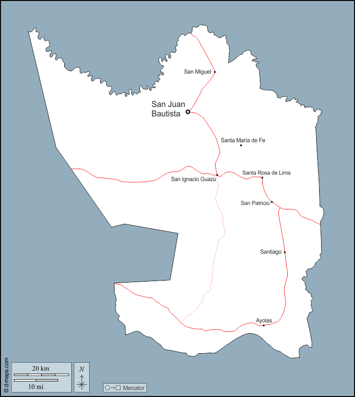d-maps > महाअमेरिका > पैराग्वे > मिसिओनेस > बाह्यरेखा, मुख्य शहरों, सड़कों, नाम