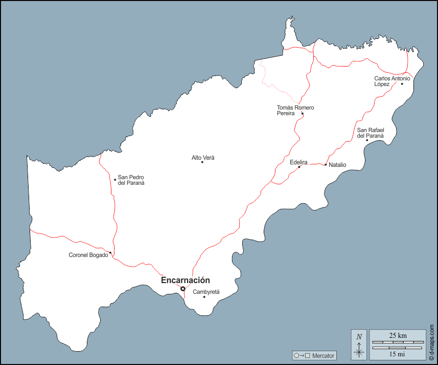 d-maps > महाअमेरिका > पैराग्वे > इटापुआ > बाह्यरेखा, मुख्य शहरों, सड़कों, नाम