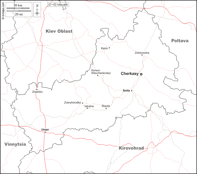 d-maps > यूरोप > यूक्रेन > चेर्कासी > सीमाओं, मुख्य शहरों, सड़कों, नाम, सफेद