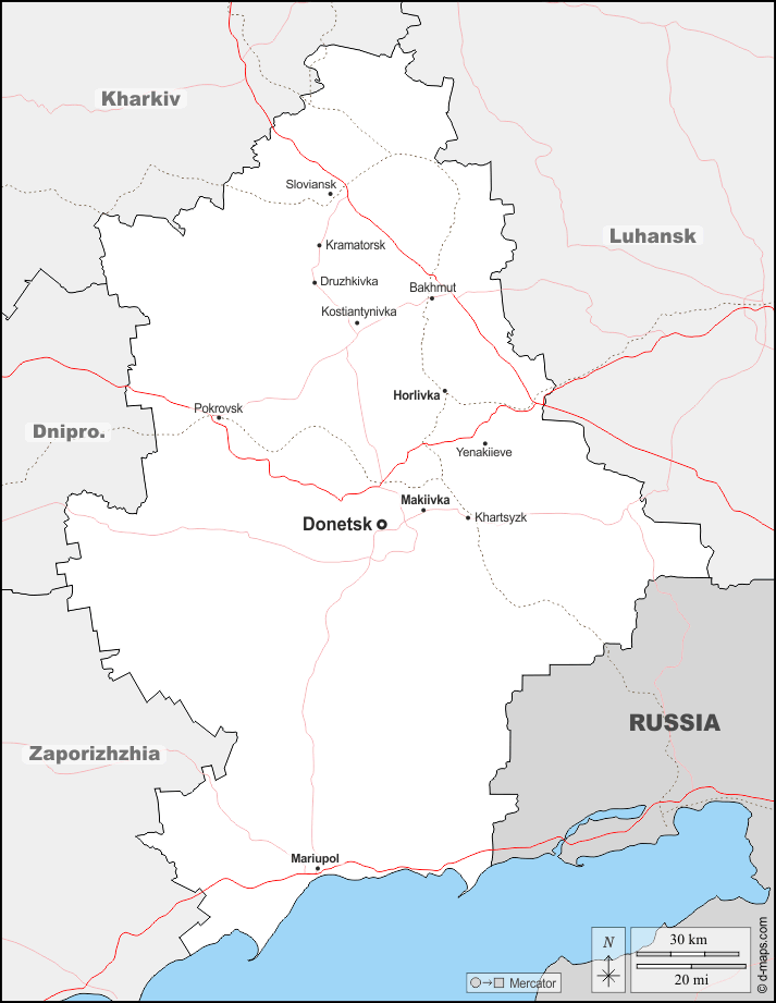 d-maps > यूरोप > यूक्रेन > दोनेत्स्क > सीमाओं, मुख्य शहरों, सड़कों, नाम