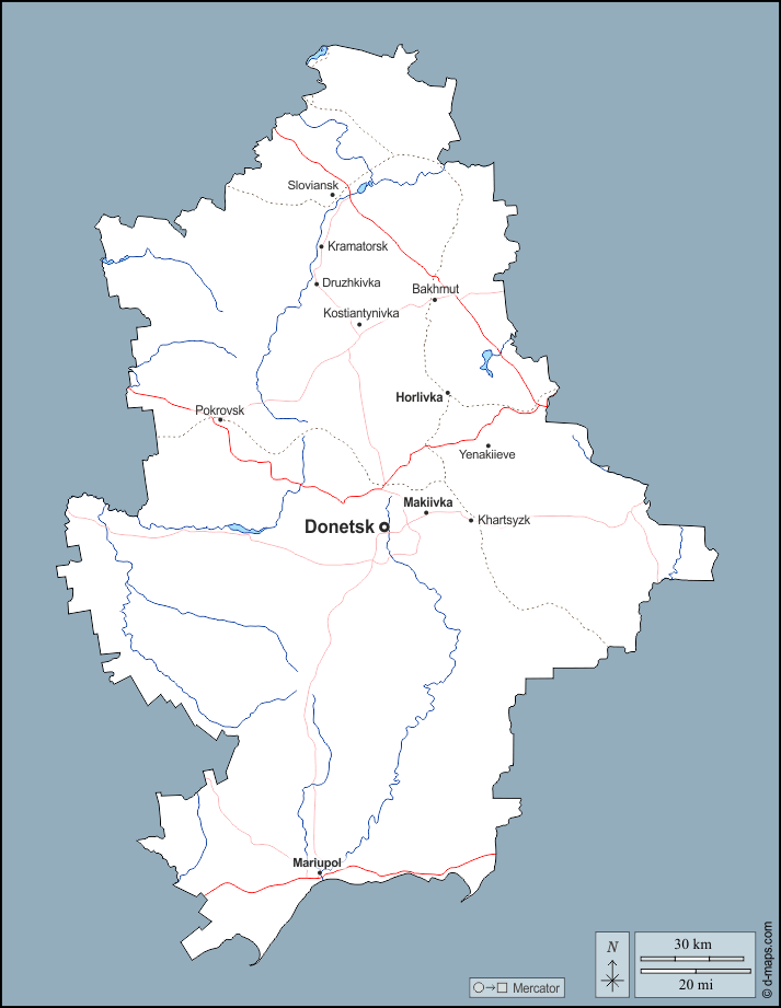d-maps > यूरोप > यूक्रेन > दोनेत्स्क > बाह्यरेखा, जल-सर्वेक्षण, मुख्य शहरों, सड़कों, नाम