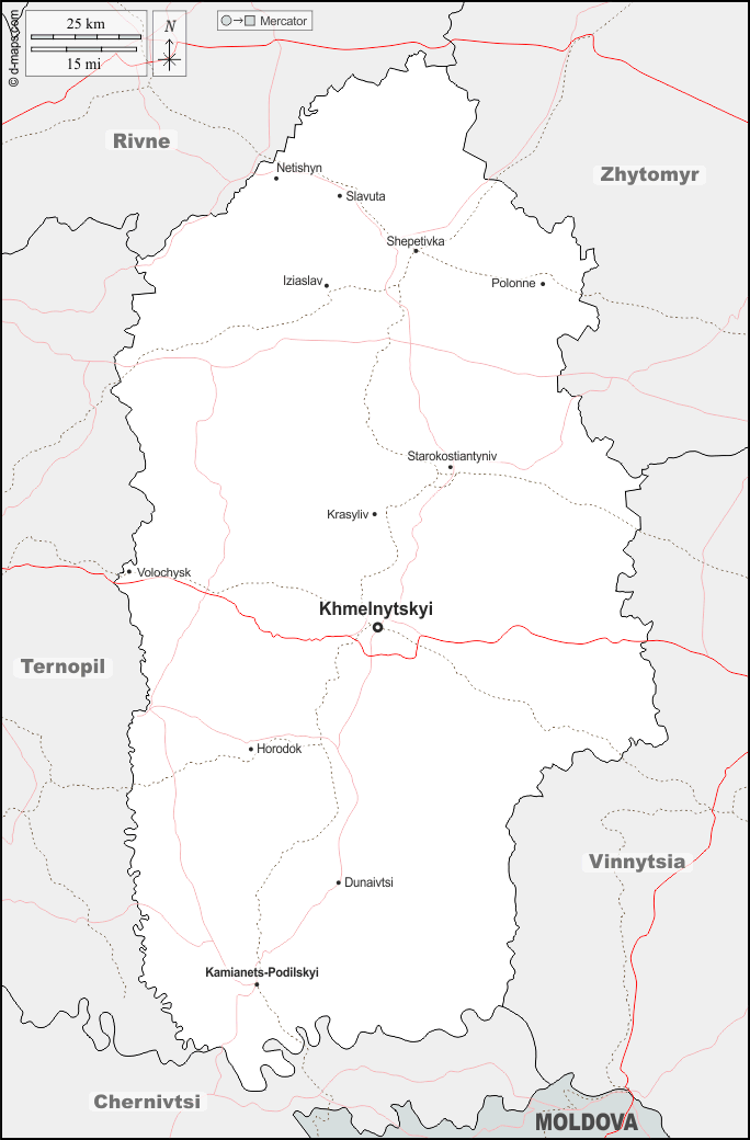 यूरोप > यूक्रेन > ख्मेल्नाइत्स्की > सीमाओं, मुख्य शहरों, सड़कों, नाम