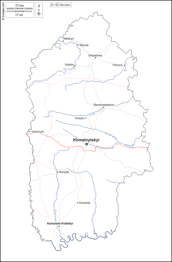 यूरोप > यूक्रेन > ख्मेल्नाइत्स्की > बाह्यरेखा, जल-सर्वेक्षण, मुख्य शहरों, सड़कों, नाम, सफेद
