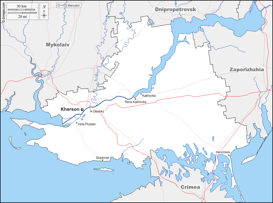 d-maps > यूरोप > यूक्रेन > खेरसॉन > सीमाओं, जल-सर्वेक्षण, मुख्य शहरों, सड़कों, नाम