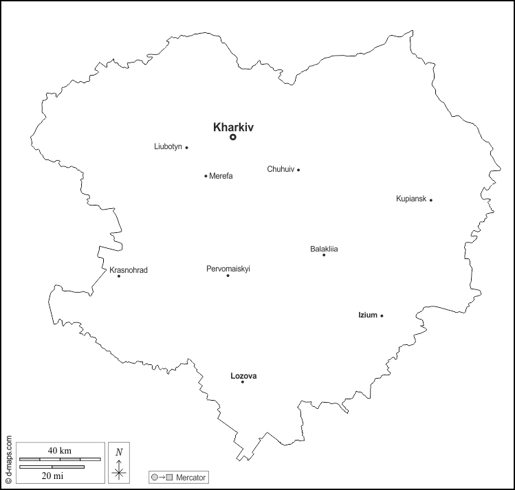 d-maps > यूरोप > यूक्रेन > खार्किव > बाह्यरेखा, मुख्य शहरों, नाम, सफेद