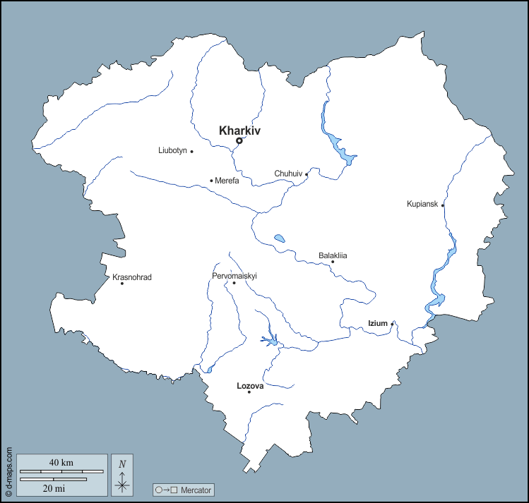 d-maps > यूरोप > यूक्रेन > खार्किव > बाह्यरेखा, जल-सर्वेक्षण, मुख्य शहरों, नाम