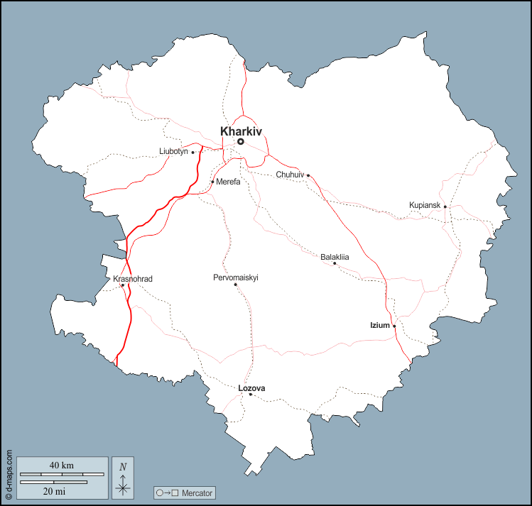 d-maps > यूरोप > यूक्रेन > खार्किव > बाह्यरेखा, मुख्य शहरों, सड़कों, नाम