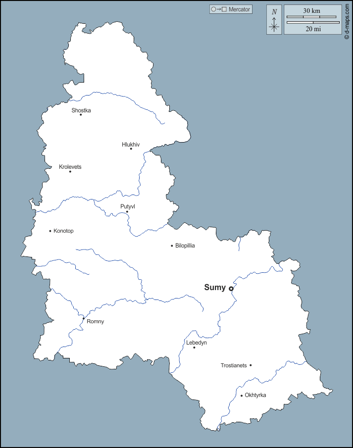 d-maps > यूरोप > यूक्रेन > सूमी > बाह्यरेखा, जल-सर्वेक्षण, मुख्य शहरों, नाम