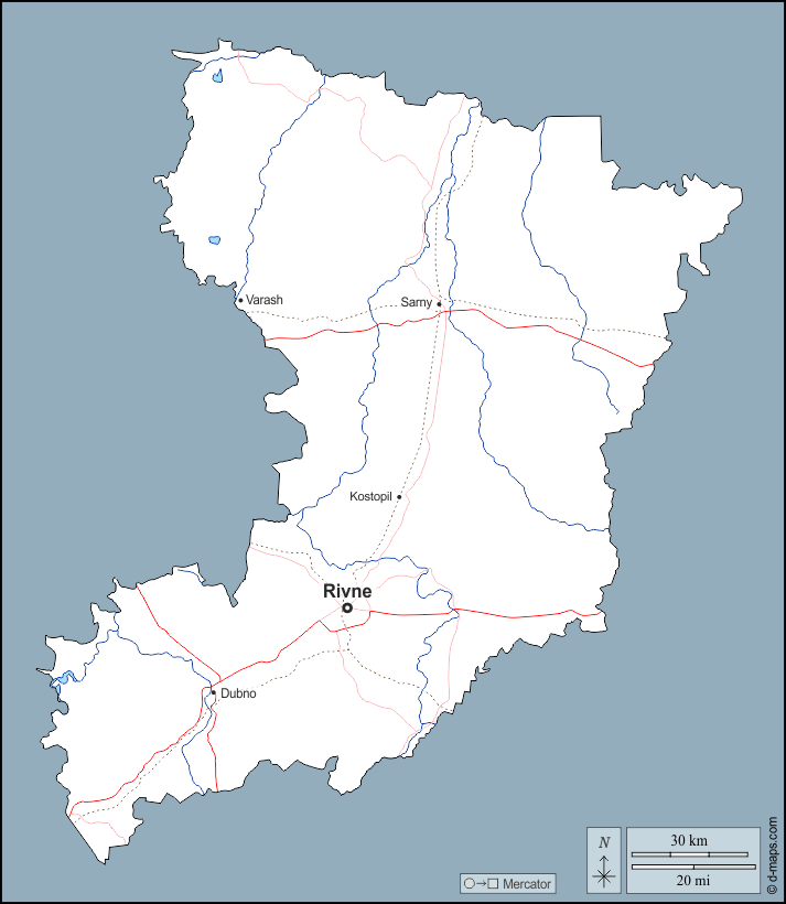 d-maps > यूरोप > यूक्रेन > रिव्ने > बाह्यरेखा, जल-सर्वेक्षण, मुख्य शहरों, सड़कों, नाम