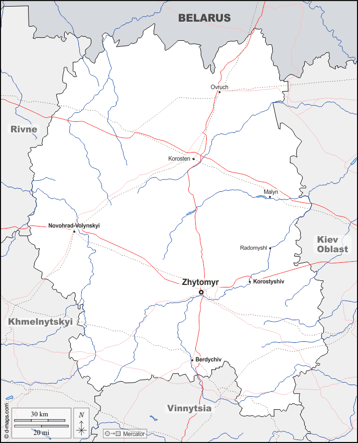 d-maps > यूरोप > यूक्रेन > ज़ाइटॉमिर > सीमाओं, जल-सर्वेक्षण, मुख्य शहरों, सड़कों, नाम