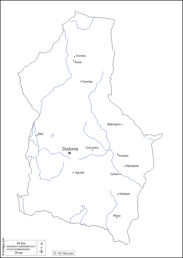 d-maps > अफ्रीका > तंजानिया > डोडोमा > बाह्यरेखा, जल-सर्वेक्षण, मुख्य शहरों, नाम, सफेद