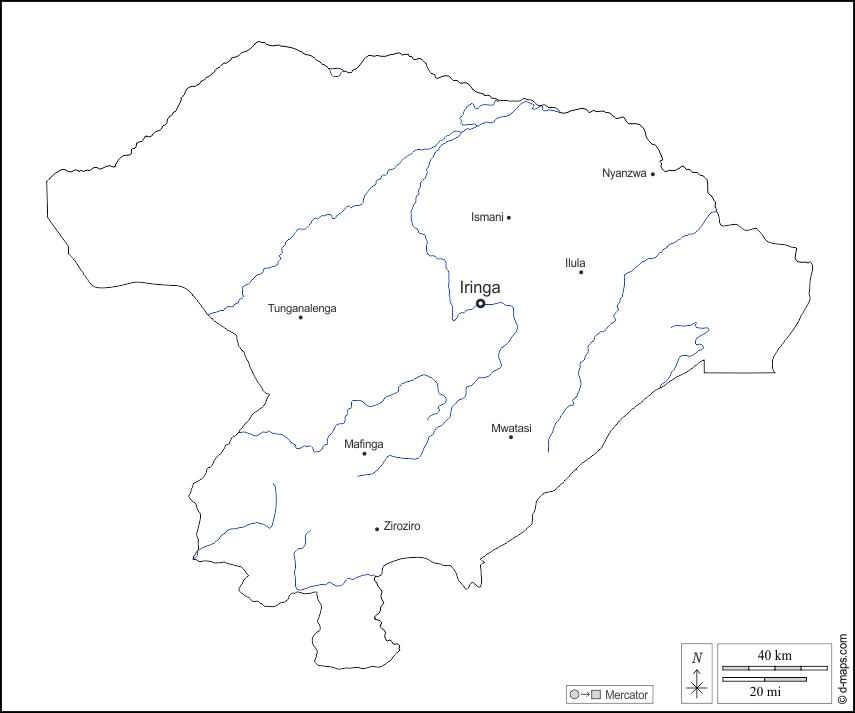 d-maps > अफ्रीका > तंजानिया > इरिंगा > बाह्यरेखा, जल-सर्वेक्षण, मुख्य शहरों, नाम, सफेद