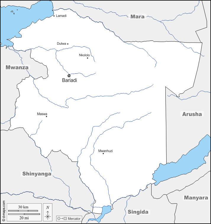 d-maps > अफ्रीका > तंजानिया > सिमियु > सीमाओं, जल-सर्वेक्षण, मुख्य शहरों, नाम