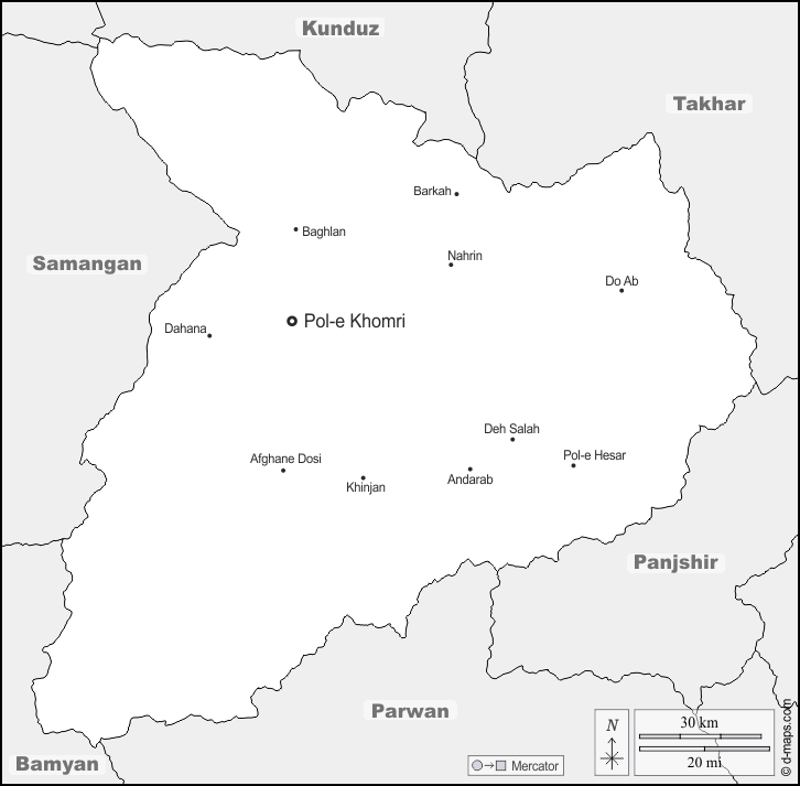 d-maps > एशिया > अफ़गानिस्तान > बग़लान प्रान्त > सीमाओं, मुख्य शहरों, नाम