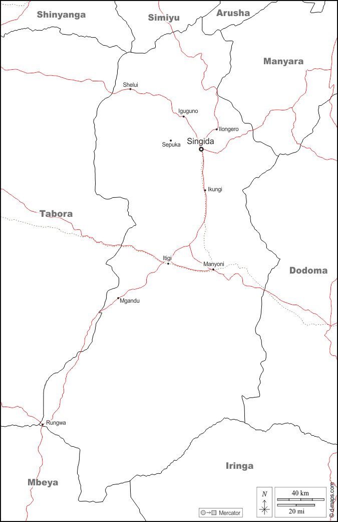 d-maps > अफ्रीका > तंजानिया > सिंगिदा > सीमाओं, मुख्य शहरों, सड़कों, नाम, सफेद