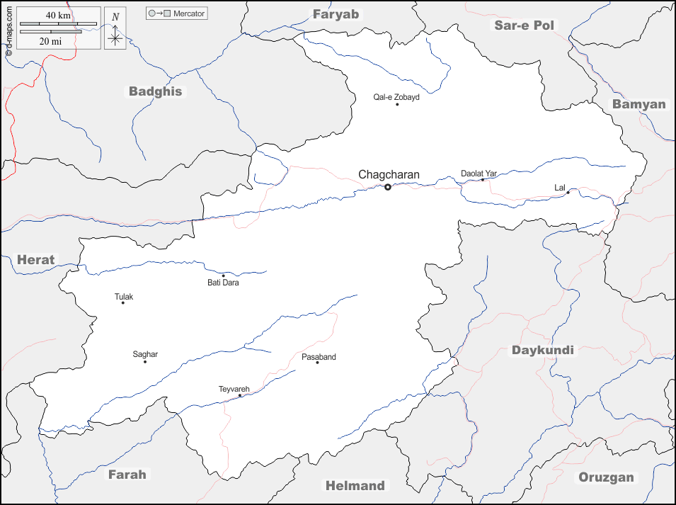 d-maps > एशिया > अफ़गानिस्तान > ग़ोर प्रान्त > सीमाओं, जल-सर्वेक्षण, मुख्य शहरों, सड़कों, नाम