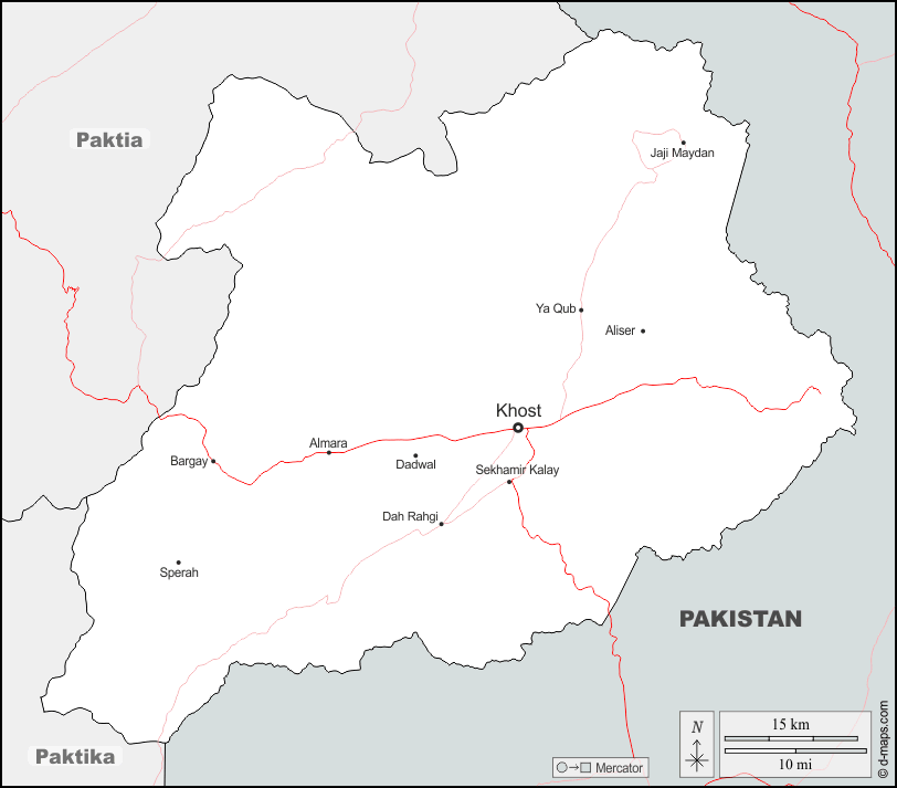 d-maps > एशिया > अफ़गानिस्तान > ख़ोस्त प्रान्त > सीमाओं, मुख्य शहरों, सड़कों, नाम