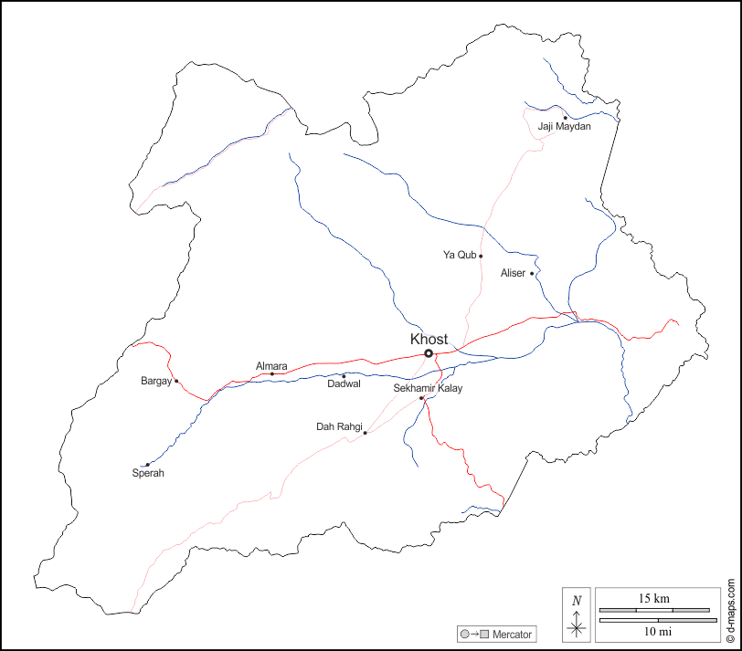 d-maps > एशिया > अफ़गानिस्तान > ख़ोस्त प्रान्त > बाह्यरेखा, जल-सर्वेक्षण, मुख्य शहरों, सड़कों, नाम, सफेद